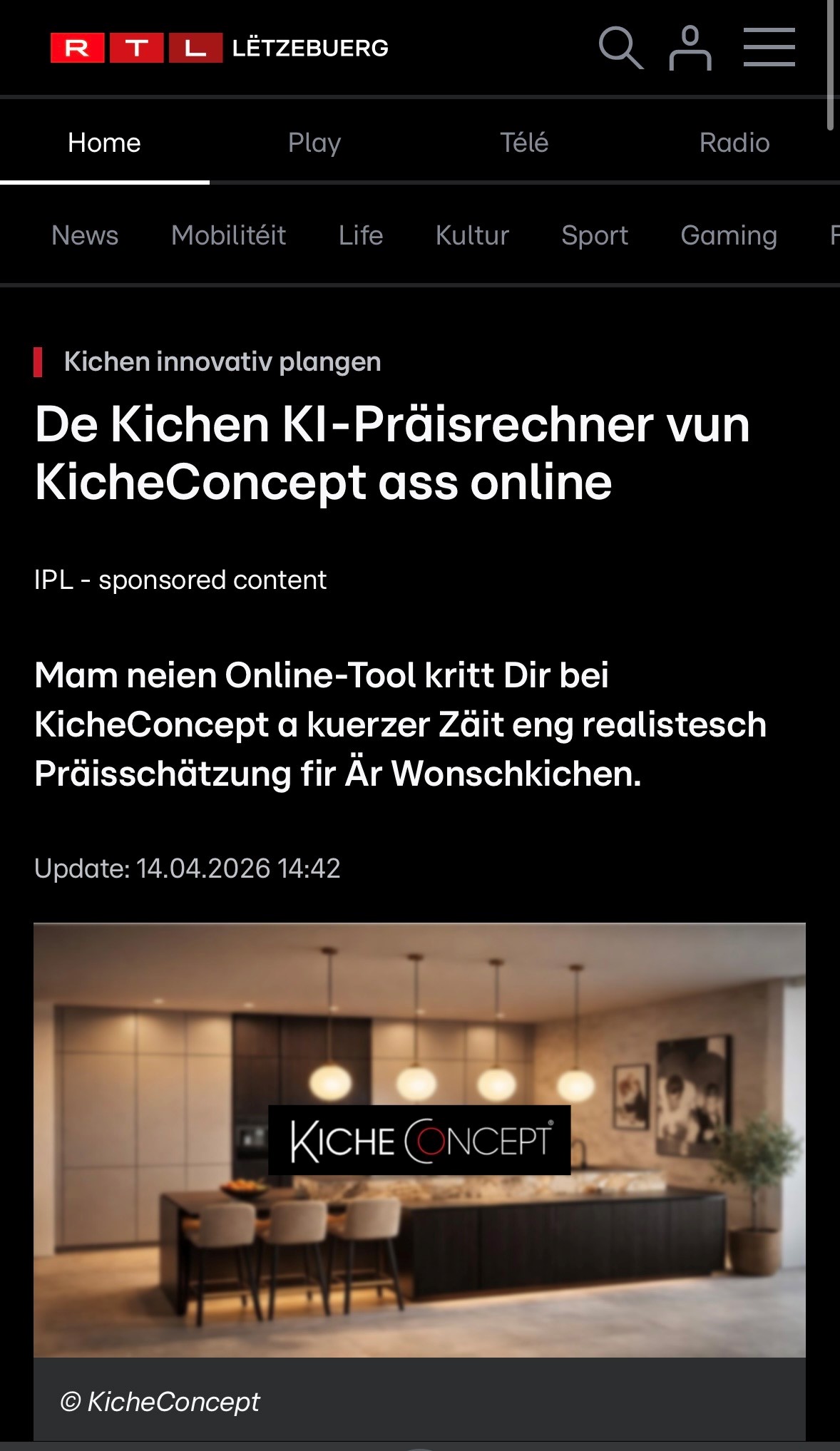 KicheConcept gouf viru kuerzem vun RTL Lëtzebuerg am Kader vun der Sendung „Inside News“ virgestallt. De Reportage stellt eisen neie KI-Präisrechner fir Kichen an de Mëttelpunkt – en innovatiivt Online-Tool, dat Interessenten eng séier an realistesch Präisschätzung fir hir Dramkichen erméiglecht.